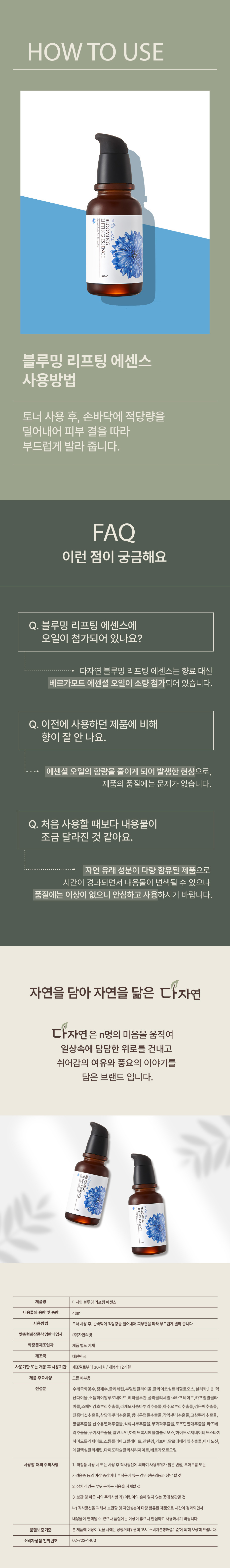 | 사용방법 | 토너 사용 후, 손바닥에 적당량을 덜어내어 피부결을 따라 부드럽게 발라 줍니다. |