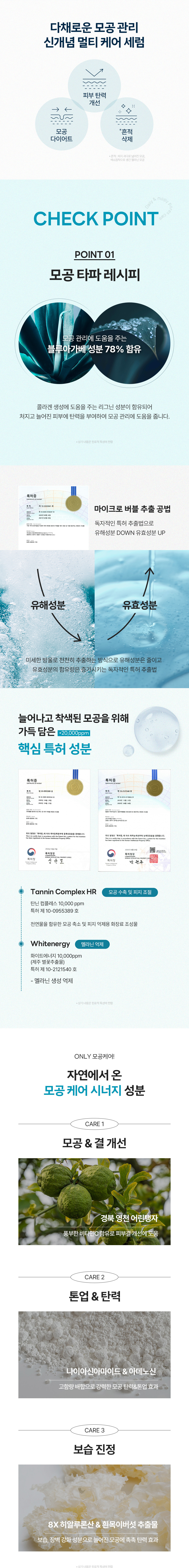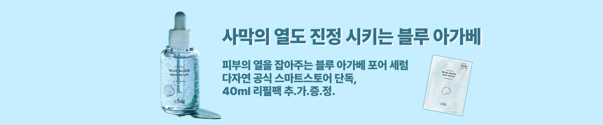 | 모든 원료성분 | 블루아가베잎추출물, 나이아신아마이드, 글리세린, 부틸렌글라이콜, 2,3-부탄다이올, 1,2-헥산다이올, 정제수, 아데노신, 폴리글리세릴-10라우레이트, 카보머, 트로메타민, 베타인, 감나무잎추출물, 포도추출물, 커피콩추출물, 호장근뿌리추출물, 잇꽃꽃추출물, 밤껍질추출물, 초피나무열매추출물, 녹차추출물, 에틸헥실글리세린, 잔탄검, 소듐파이테이트, 탱자추출물, 락토바실러스발효물, 별꽃추출물, 덱스트린, 소듐하이알루로네이트, 흰목이버섯추출물, 치자추출물, 하이드록시프로필트라이모늄하이알루로네이트, 토코페롤, 하이드롤라이즈드하이알루로닉애씨드, 소듐아세틸레이티드하이알루로네이트, 하이알루로닉애씨드, 소듐하이알루로네이트크로스폴리머, 하이드롤라이즈드소듐하이알루로네이트, 포타슘하이알루로네이트 |